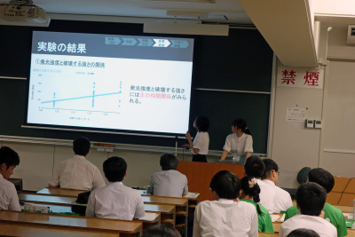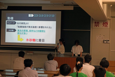 長野県の代表として物理分野で「氷砂糖の摩擦発光~接触面積と破壊する強さが及ぼす影響~」のタイトルで発表を行いました。