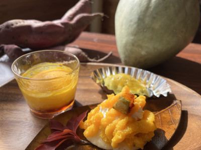 グループ毎に、清内路かぼちゃのプリン&モンブラン、紅はるかのスイートポテトをつくり、ワンプレートに飾り付けました(^_^)v
