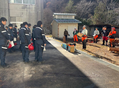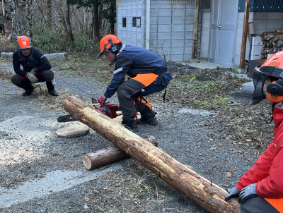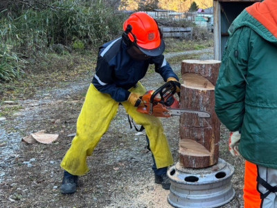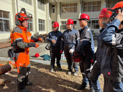 木曽林業研究グループ連絡協議会のご協力で、森林環境科2年生が、実際に林業現場で活躍される林業士の皆様にチェーンソーによる伐採技術をご指導いただきました。