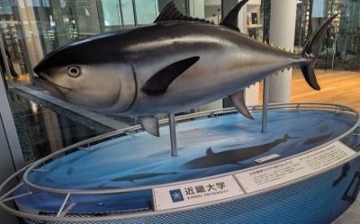 写真:大学の概要説明、海のダイヤ近代マグロ近大の原寸大レプリカ