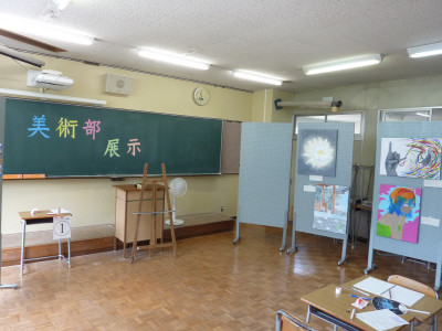美術部展示では日々の活動から完成した作品が多く展示されました(左側)。