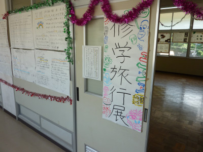 2学年では12月に参加する修学旅行の事前学習の展示も行われました(左側)。関西方面へ行く予定です。