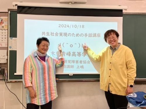 10月10日(木)、18日(金)に3学年で行いました。聴覚障がい者の当事者、上嶋さん、伊藤さんが講師でした。災害が起きた時には、耳が聞こえない人を助けて欲しいとお話してくれました。生徒たちは話に聞き入っていました。ありがとうございました!