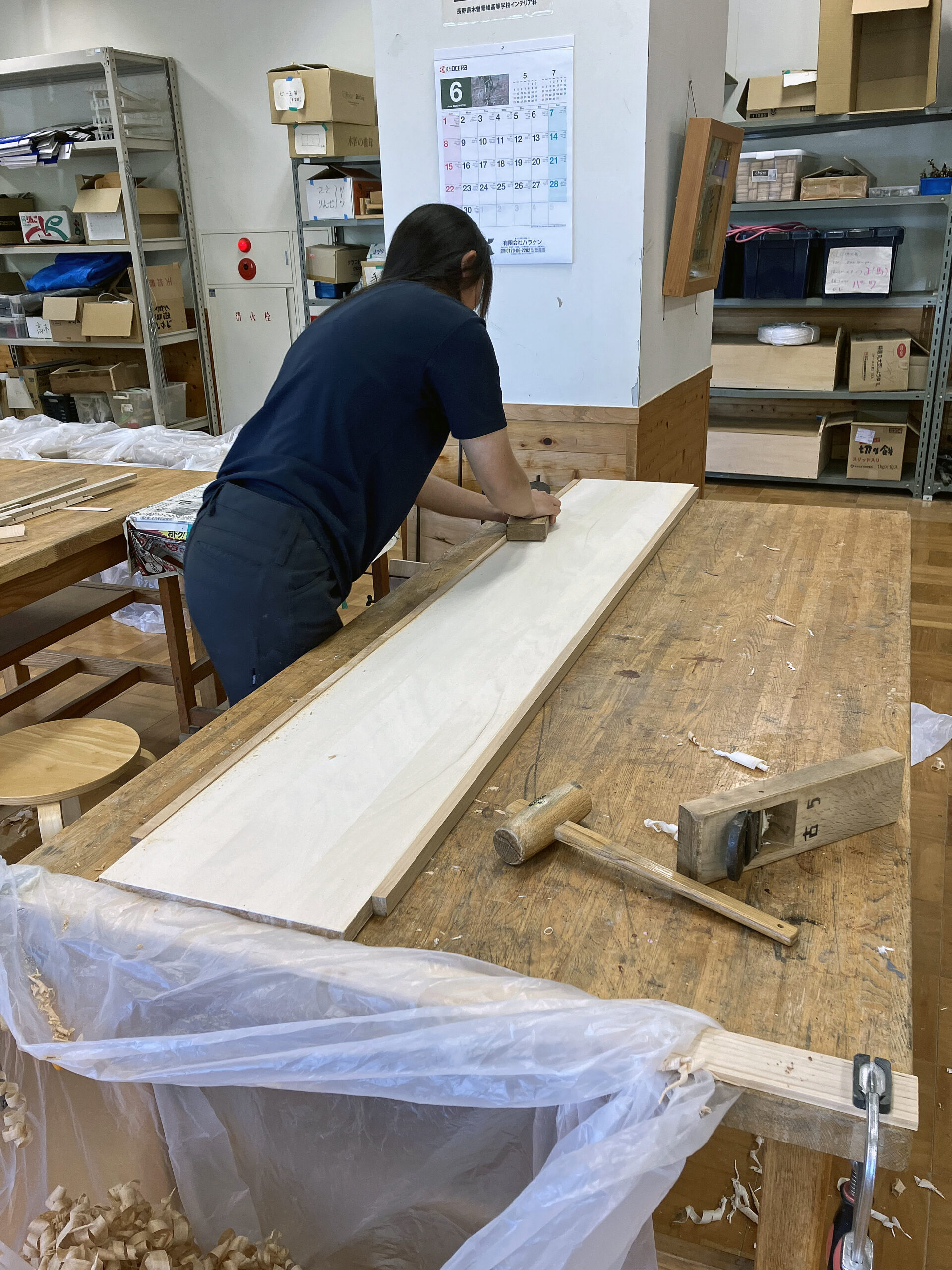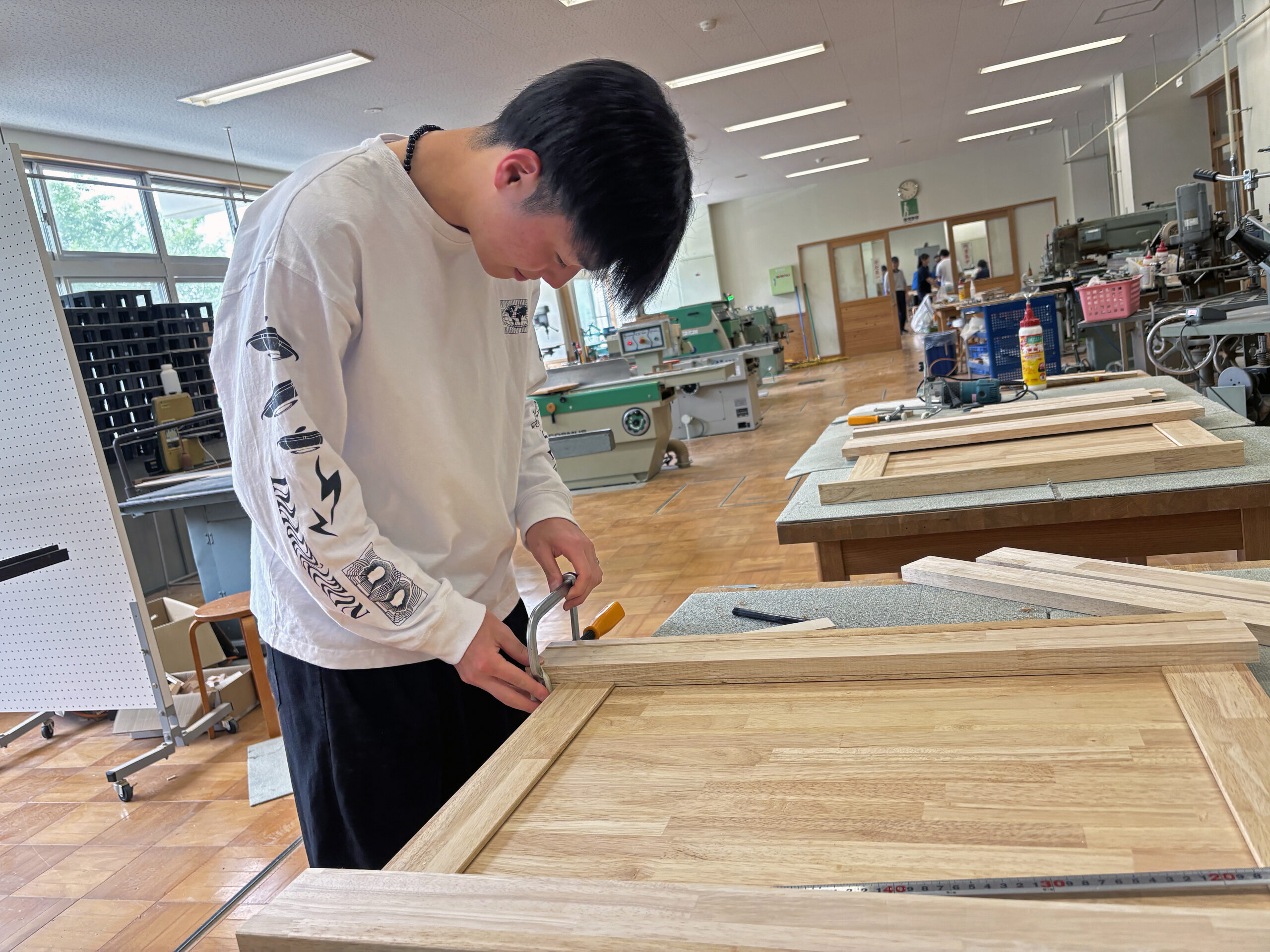 2・3 年生では高さ900〜1800×幅900×奥行300程度作品製作をとおし木材の加工・組立・塗装方法や加工機械の使用方法など基本的な学習を行います。