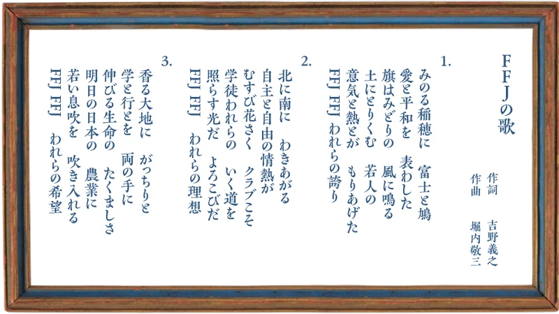 日本学校農業クラブ連盟【Future Farmers of Japan (略称 日連 または FFJ)】は、 1950年(昭和25年)「科学性」「社会性」「指導性」の育成を目標に、日本全国の農業クラブの全国組織として結成されました。